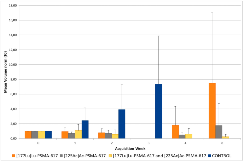 Fig. 10. Evolution of normalized tumour volume in 0–8 week after each treatment. Continuous tumour expansion was observed in all mice in the control group. The maximum volume was observed in week 3, when the mice were sacrificed, as established in the protocol. In groups that received a single dose of [177Lu]Lu-PSMA-617 or [225Ac]Ac-PSMA-617, an initial reduc tion of tumour volume was verified, followed by a rapid tumour development between weeks 4 to 8. In the combined treatment with both radiopharmaceuticals, tumour volume decreased over weeks, being undetectable in 40% of subjects at week 8.