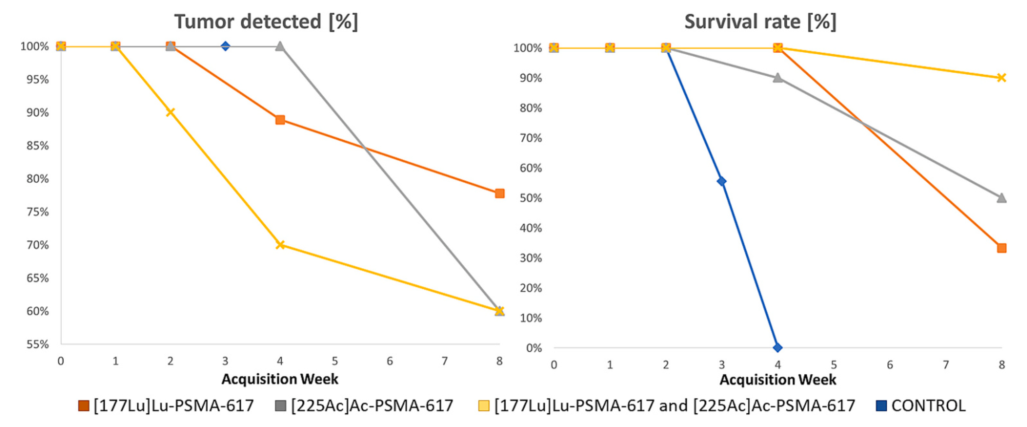 Methods: In vitro properties of [225Ac]Ac-PSMA-617 using the human prostatic cancer cell lines, LNCaP (PSMA+) and PC3 (PSMA-) were investigated by means of antiproliferative, binding, cytotoxicity and clonogenic studies. In vivo de-escalated treatment protocols of actinium-225/lutetium-177-PSMA-617 “cocktail”-regimens were also assessed in order to improve the tolerability of 225Ac-PSMA-617 TAT. A four-branch study with ([177Lu]LuPSMA-617 and [225Ac]Ac-PSMA-617) or its combination was successfully performed in a xenographic nude mice model bearing prostate cancer. Tumour growth was monitored by external caliper measurements and PET-CT imaging with [18F]F-AlF-PSMA-11 over two months.