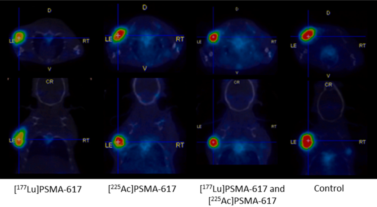 Introduction: The interest in targeted alpha therapy (TAT) has grown in the recent years as it can provide new treatment options for advanced- and late-stage cancer. In this sense, the use of actinium-225 is rising showing promising results. Even more, combining alpha and beta (lutetium-177) radionuclides might help to minimize actinium adverse effects, while preserving treatment efficacy. Preclinical studies of actinium-225-PSMA-targeting tracers for advanced prostate cancer and the “cocktail” combination with lutetium-177-PSMA needs to be further explored.