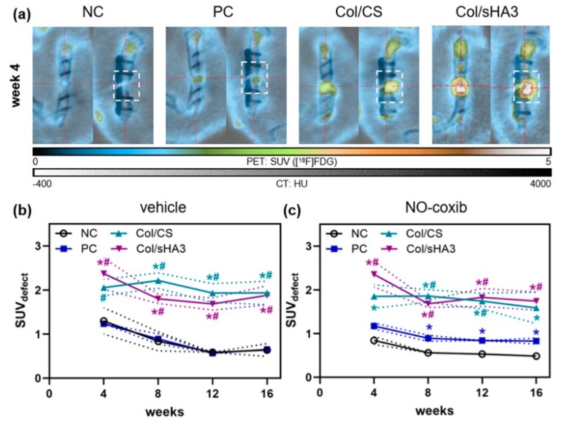 Figure 1. [18F]FDG accumulation in the femur defect after insertion of no material (NC), a mixture of collagen and autologous bone fragments (PC), or PCL-scaffolds coated with a mixture of either collagen and chondroitin sulfate (Col/CS) or collagen and polysulfated hyaluronic acid (Col/sHA3). (a) Representative PET/CT images at 4 weeks post-surgery. (b,c) [18F]FDG accumulation in the bone defect (dashed box) was determined (SUVdefect) at 4, 8, 12, and 16 weeks post-surgery without ((b), vehicle solution only) or with adjuvant administration of NO-coxib (c).