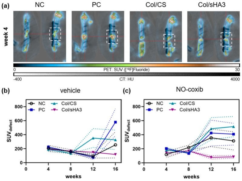 Figure 2. [18F]Fluoride accumulation in the femur defect after insertion of no material (NC), a mixture of collagen and autologous bone fragments (PC), or PCL-scaffolds coated with a mixture of either collagen and chondroitin sulfate (Col/CS) or collagen and polysulfated hyaluronic acid (Col/sHA3). (a) Representative PET/CT images at 4 weeks post-surgery. (b,c) [18F]Fluoride accumulation in the bone defect (dashed box) was determined (SUVdefect) at 4, 8, 12, and 16 weeks post-surgery without ((b), vehicle solution only) or with adjuvant administration of NO-coxib (c).