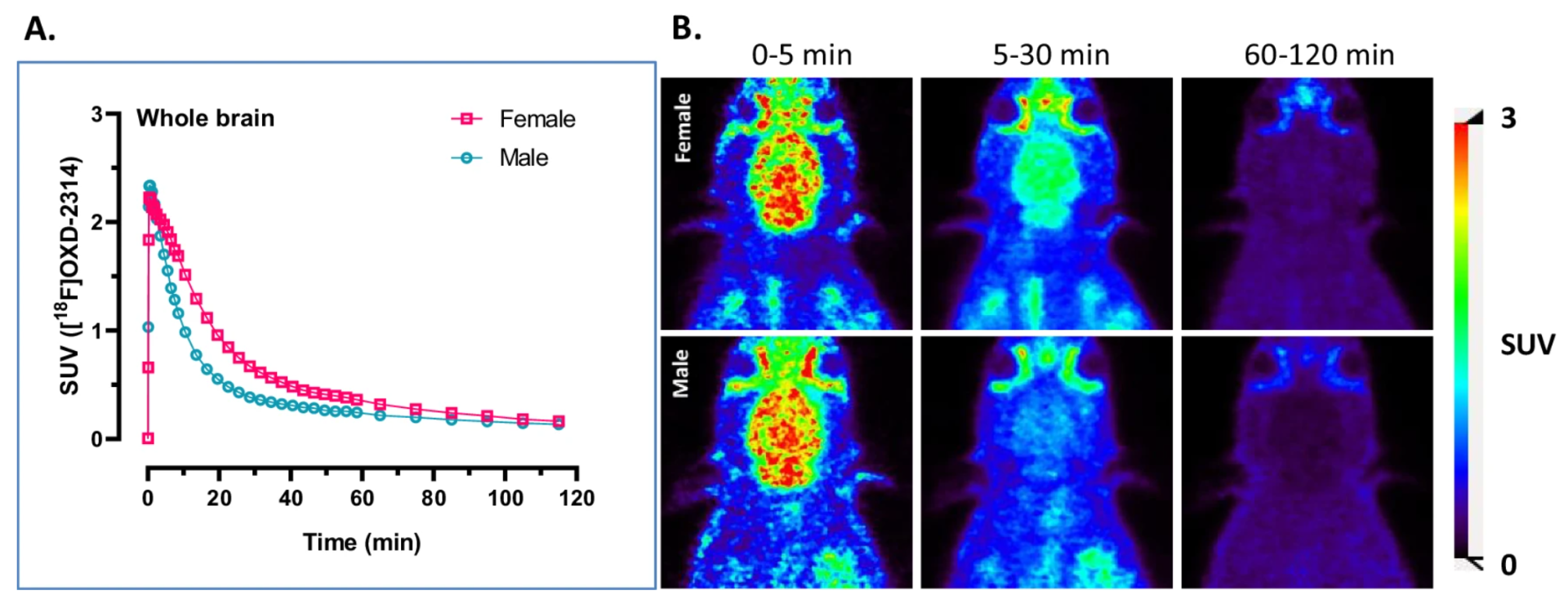 Figure 4. A Whole brain time-activity curves of standardized uptake values (SUV) in female (pink, n = 1) and male (blue, n = 1) rat whole brains in baseline PET-CT scans using [18F]OXD-2314 (0−120 min). B Representative PET summation images of rat brain from baseline PET scans using [18F]OXD-2314. Top row shows transverse images of a male wild-type rat brain at 0–5, 5–30, and 60–120 min; bottom row shows transverse images of a female wild-type rat brain at the same time points.