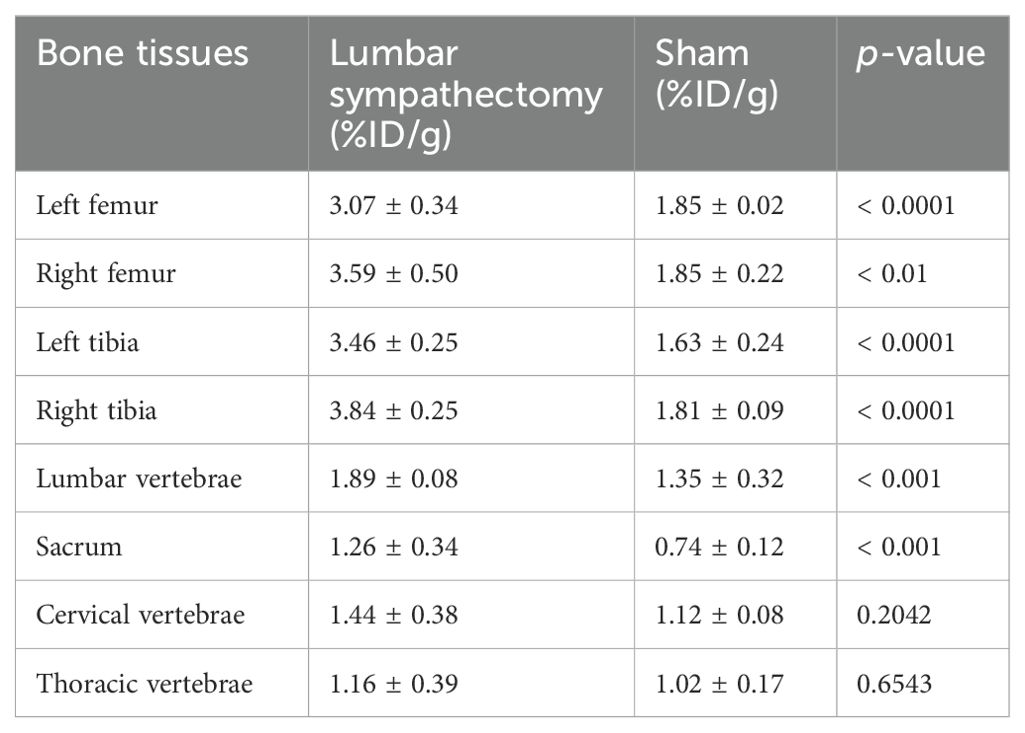 Nine weeks after surgery, the lumbar sympathectomy group exhibited significantly higher radioactivity levels compared to the control group in the left femur, right femur, left tibia, right tibia, lumbar vertebrae, and sacrum. However, no significant differences were observed in the cervical vertebrae and thoracic vertebrae between the two groups (Figure 5C). Detailed data were listed in Table 3.