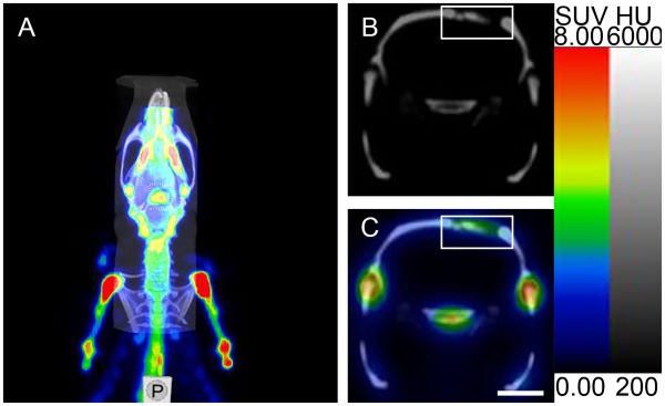 FIGURE 2: Micro SPECT/CT imaging analysis of ROI. (A) Micro SPECT/CT fusion image. (B, C) Micro-CT transverse slice and Micro SPECT/CT fusion transverse slice showing [99mTc]Tc-MDP in the area surrounding the cranial fracture (the rectangular region represents the cranial fracture and the area of [99mTc]Tc-MDP uptake). Scale bar: 5 mm.