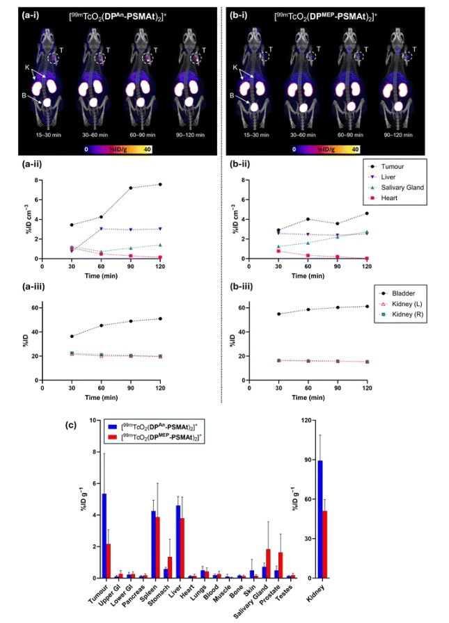 SPECT/CT scanning and biodistribution studies: The 99mTc radiotracers (3.9–4.5 MBq, 3 mice per group, containing DPAn-PSMAt = 3.0 µg or DPMEP-PSMAt = 3.5 µg) were administered via tail vein injection under isoflurane anaesthesia. Following this, SPECT/CT scanning was carried out in one of two methods outlined below, to maintain 2 h biodistribution timepoints: