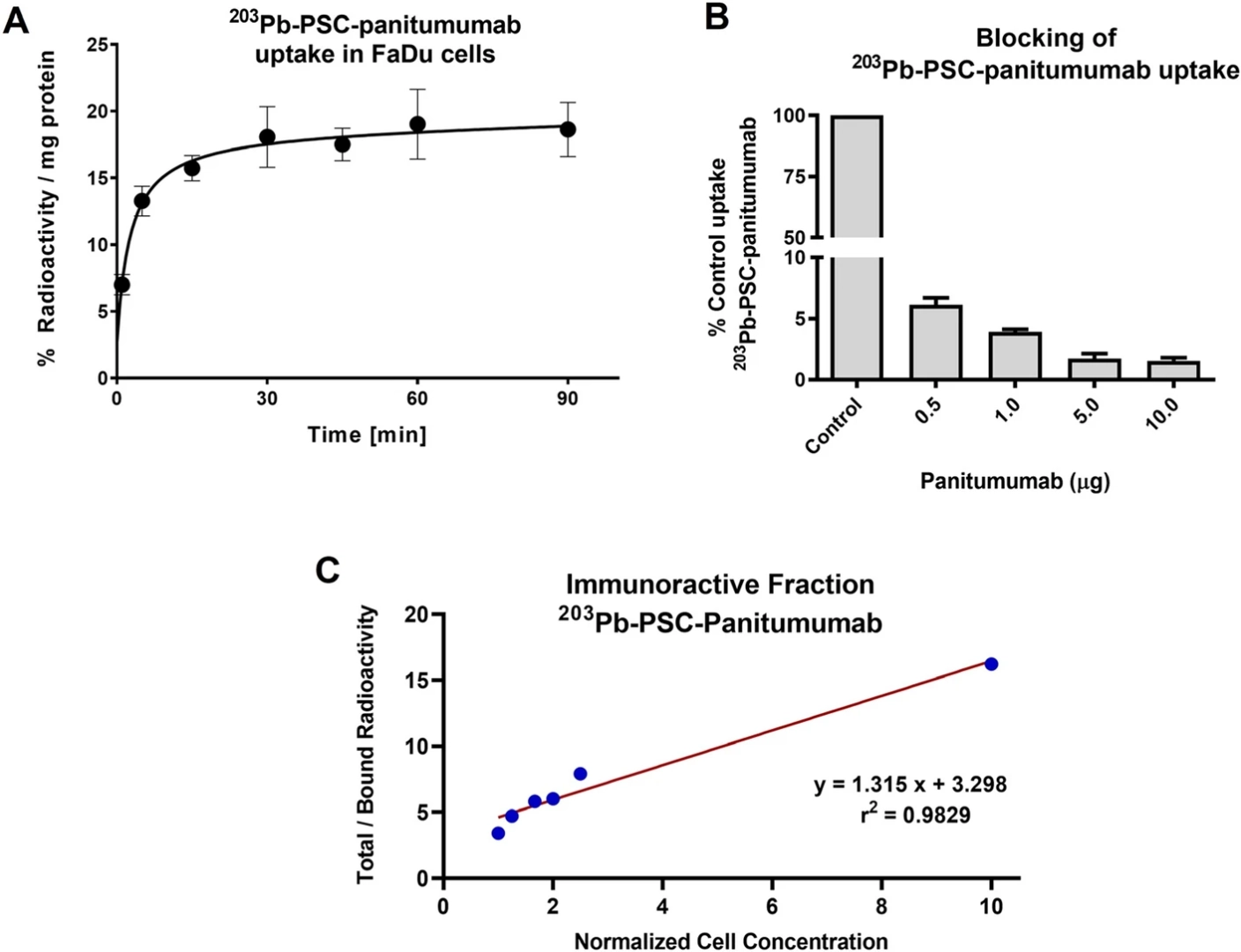 Fig. 2. Cellular uptake and competitive binding studies confirmed specific EGFR targeting of 203Pb-PSC-panitumumab in FaDu cells, supported by Lindmo assay results.