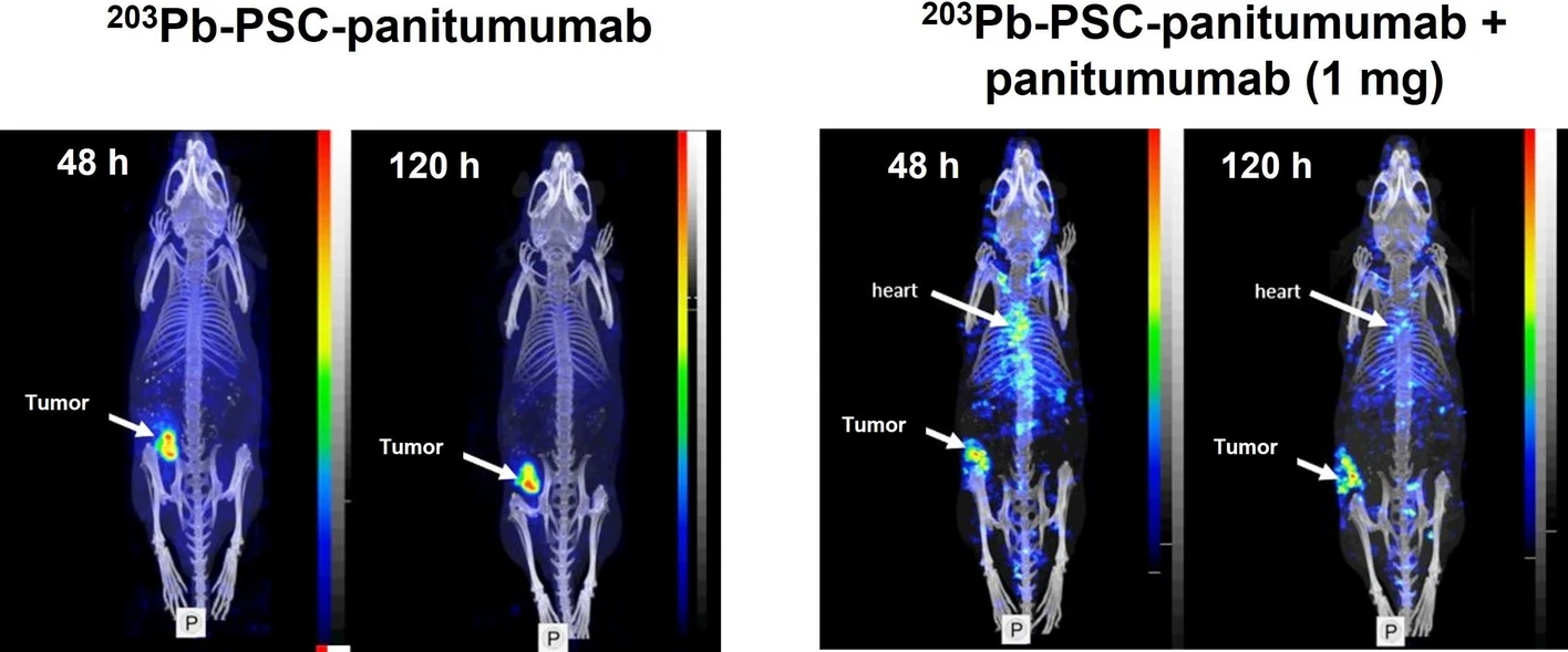 SPECT/CT imaging was performed using the Mediso nanoScan® SPECT/CT system to visualize the biodistribution of 203Pb-PSC-panitumumab in mice bearing EGFR-positive HNSCC tumors, with clear tumor localization observed at both 48 and 120 hours post-injection. Under EGFR blocking conditions, SPECT/CT images demonstrated a significant reduction in tumor uptake accompanied by increased radioactivity in the heart and blood pool, indicating effective receptor blockade. The remaining tumor radioactivity detected despite blocking is attributed to the enhanced permeability and retention (EPR) effect, a phenomenon commonly observed in immunoPET and immunoSPECT imaging of solid tumors. These results highlight the selective and sustained tumor targeting capability of 203Pb-PSC-panitumumab and underscore the utility of this radioligand for specific imaging of EGFR-expressing tumors using the Mediso nanoScan® platform. (Fig.3)