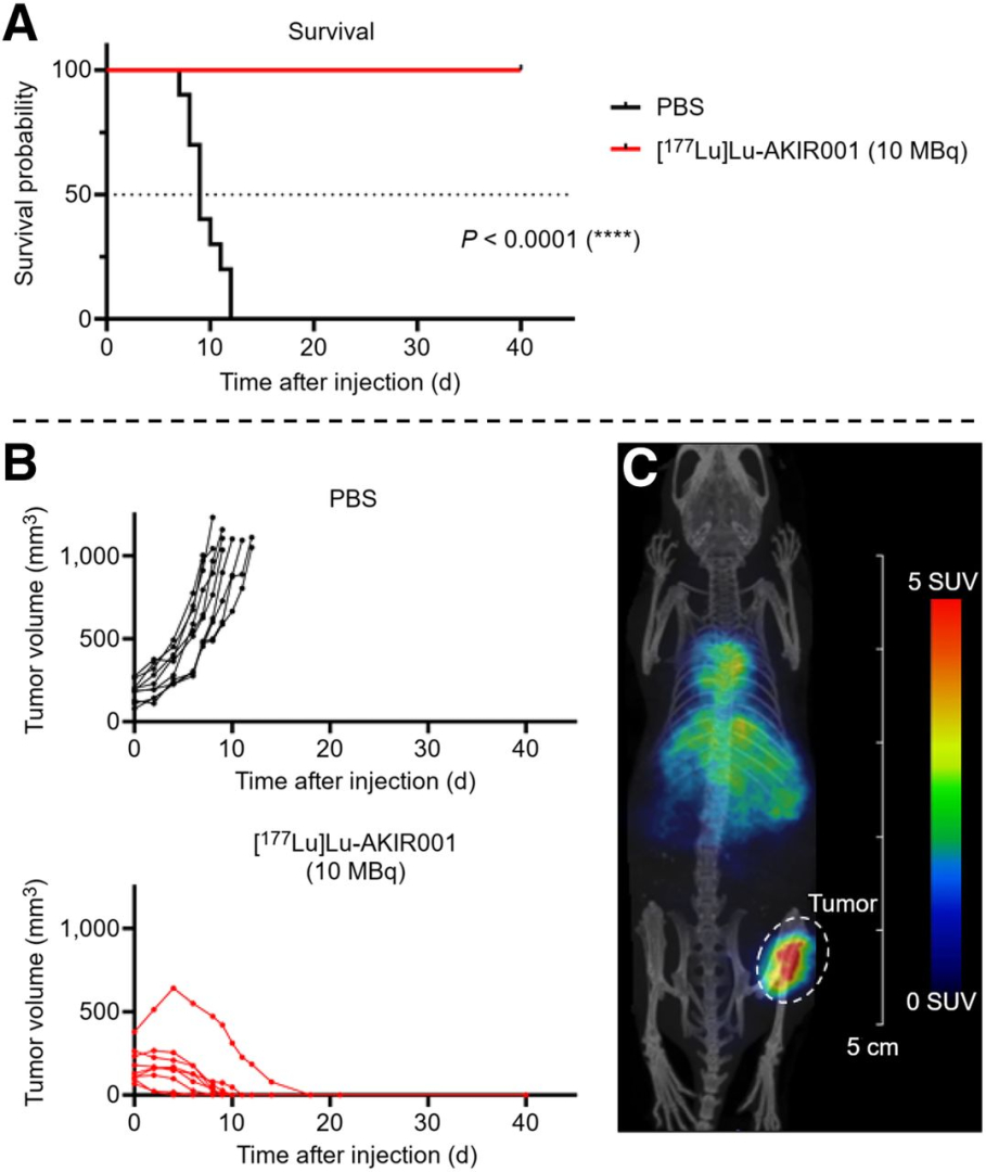 Figure 4.: Efficacy studies on BHT-101. (A) Kaplan–Meier survival plot of mice carrying BHT-101 xenografts treated with either placebo (phosphate-buffered saline, n = 10) or 10 MBq of [177Lu]Lu-AKIR001 (n = 9, N = 19). (B) Individual tumor growth by treatment group. (C) Small-animal SPECT/CT of mouse carrying BHT-101 xenograft injected with 10 MBq of [177Lu]Lu-AKIR001 at 4 d after injection.