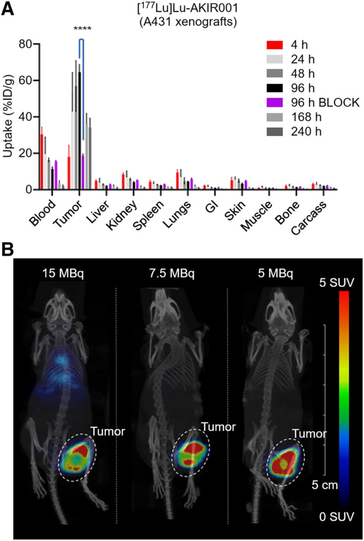 Figure 1.: Biodistribution and small-animal SPECT imaging at 3 dose levels of 177Lu-AKIR001 in A431 xenografts. (A) Biodistribution of 177Lu-AKIR001 (15 µg) in BALB/c nu/nu mice carrying A431 xenografts, terminated at 4, 24, 48, 96, 168, and 240 h after injection. In vivo block using 30-fold molar excess of nonradiolabeled AKIR001 was evaluated at 96 h after injection.