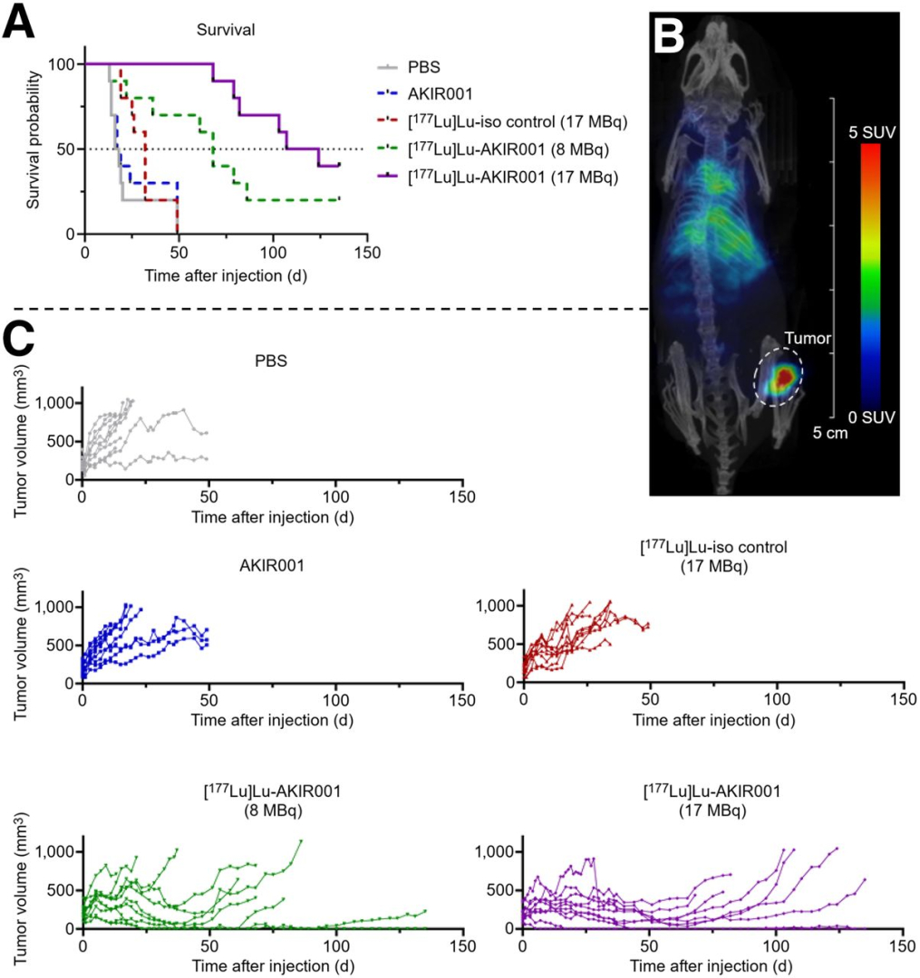 Figure 3.: Efficacy studies on ACT-1. (A) Kaplan–Meier survival of animals carrying ACT-1 xenografts (high CD44v6) treated with phosphate-buffered saline, nonradiolabeled AKIR001, [177Lu]Lu-iso control (AK-MO176-156, hIgG1 LALA isotype control, 17 MBq), or high dose (17 MBq) or low dose (8 MBq) of [177Lu]Lu-AKIR001. (B) Small-animal SPECT of mouse injected with 17 MBq of [177Lu]Lu-AKIR001 at 4 d after injection. (C) Individual tumor growth by treatment group.