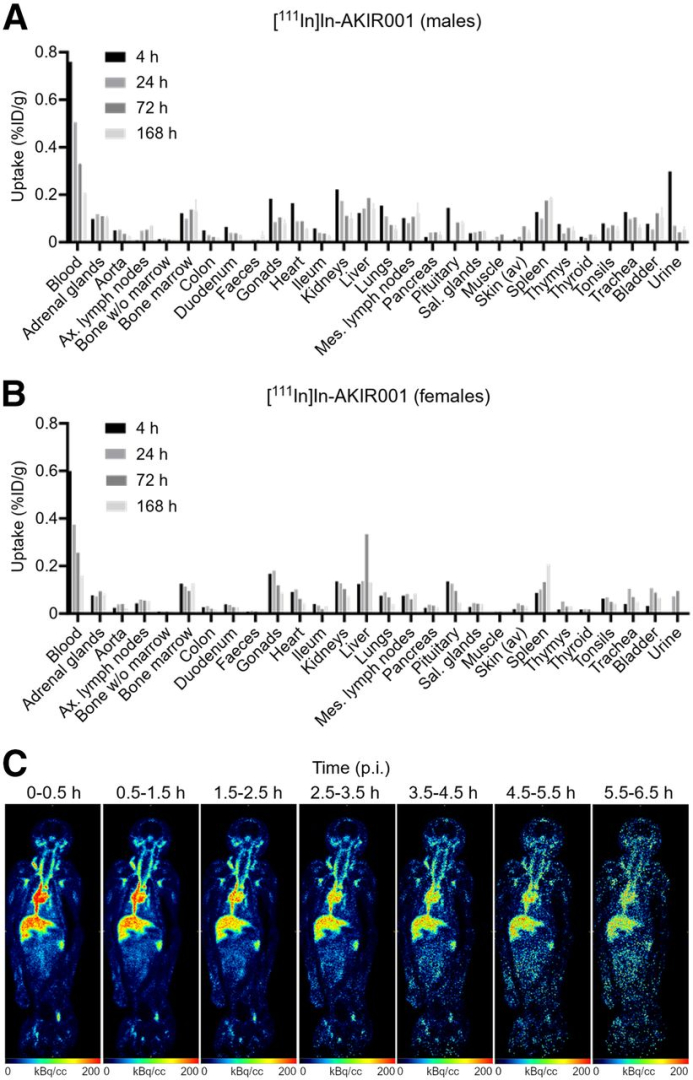 Figure 5.: Biodistribution of [111In]In-AKIR001 in male (A) and female (B) New Zealand white rabbits (presented as percentage injected dose [%ID] per gram) at 4, 24, 72, and 168 h after injection (N = 9; n = 5 males and n = 4 females). (C) Whole-body 68Ga PET images of cynomolgus macaque showing biodistribution of [68Ga]Ga-UU-40IAHA at different time points.