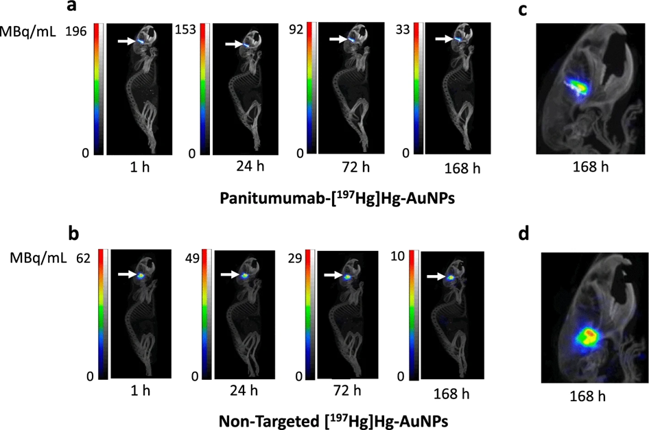 Figure 5. SPECT/CT images of NRG mice with orthotopic U251-Luc human GBM tumours in the right hemisphere of the brain administered a panitumumab-[197Hg]Hg-AuNPs or b non-targeted [197Hg]Hg-AuNPs by CED (arrows) at selected times up to 168 h post-infusion (p.i.). Intensity scales (MBq/mL) are shown for each timepoint post-infusion. Magnified view of the head showing differences in local diffusion from the infusion site in the brain for c panitumumab-[197Hg]Hg-AuNPs or d non-targeted [197Hg]Hg-AuNPs