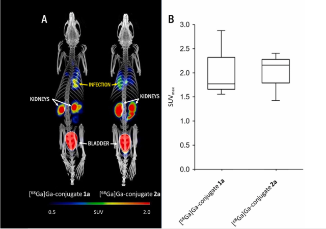 Fig. 6. (A) Static PET/CT imaging of rats with AFU lung infection, performed 45 min after injection of [68Ga]Ga-conjugate 1a and [68Ga]Ga-conjugate 2a, showing rapid accumulation in infected lung tissue alongside pronounced renal uptake related to elimination of the compounds. (B) Comparison of radioactive signal uptake in the lungs of AFU-infected rats (n = 3). Results are expressed as SUVmax.