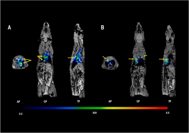 Figure 7. Static PET/MRI imaging of rats with AFU lung infection, injected with (A) [68Ga]Ga conjugate 1a and (B) [68Ga]Ga-conjugate 2a 60 min p.i.. Whole body MRI images fused with PET images of lung area only, showing clear accumulation in infected lung tissues (yellow arrows). AP = axial projection; CP = coronal projection; TP = transversal projection.